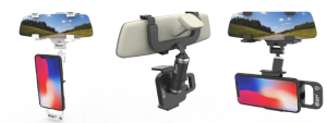 車のミラーに組み込まれたスマートフォンホルダーはワイヤレス充電機能を備え、フロントカメラと連動して道路状況を記録し、室内カメラで車内を撮影する。本装置はスマートフォンでライブ映像を見ながら、アプリ経由で現地操作と遠隔操作の両方が可能。さらに、車内に乳幼児を置き去りにした場合の警告機能など、数多くの独自機能を有する。